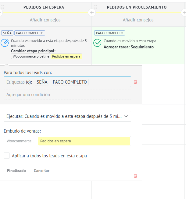 osea como veran en el woocommerce pipeline tengo PEDIDOS EN ESPERA y PEDIDOS EN PROCESAMINETO pero no dice enviar whatsapp ni nada.