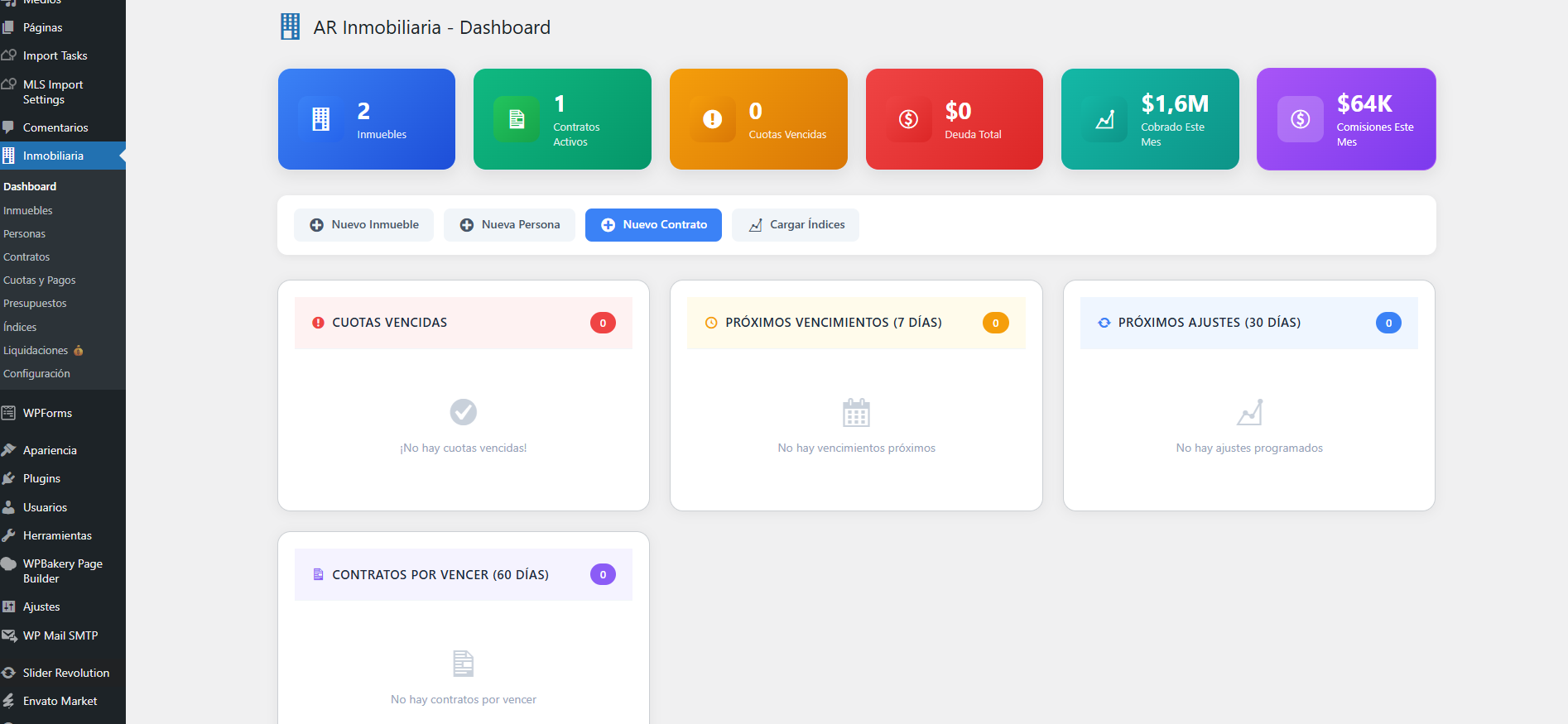 Contratos: El corazón del sistema - vincula inmueble + propietario + inquilino con fechas, montos, depósitos