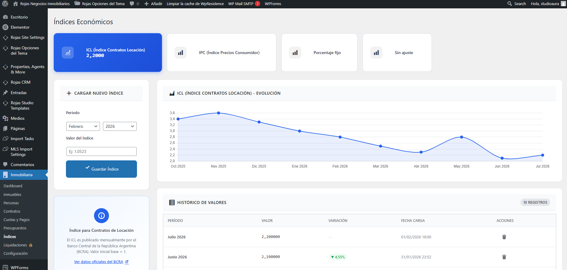 Ajustes automáticos por ICL/IPC: Carga los índices y el sistema calcula los ajustes según la Ley de Alquileres
